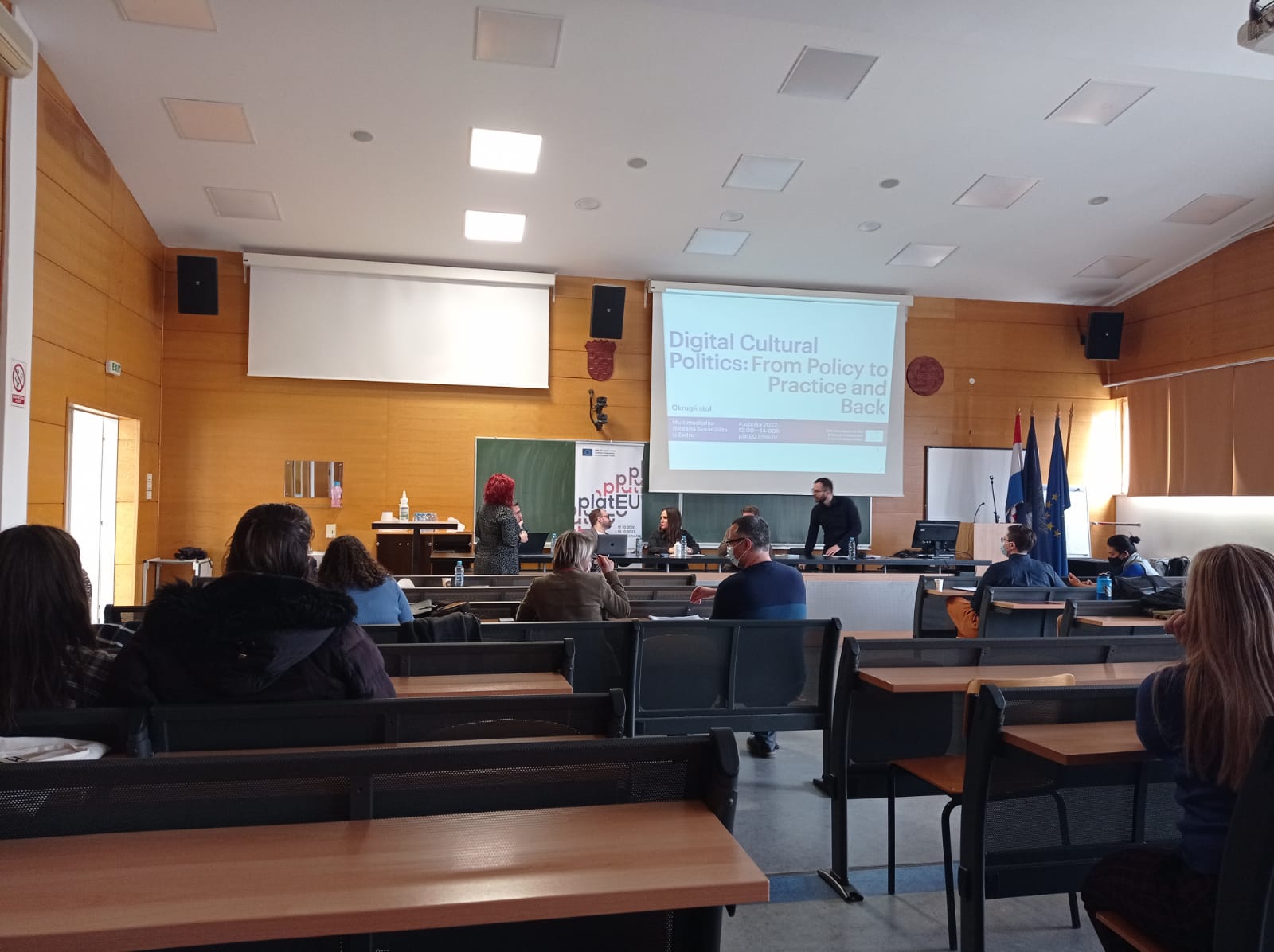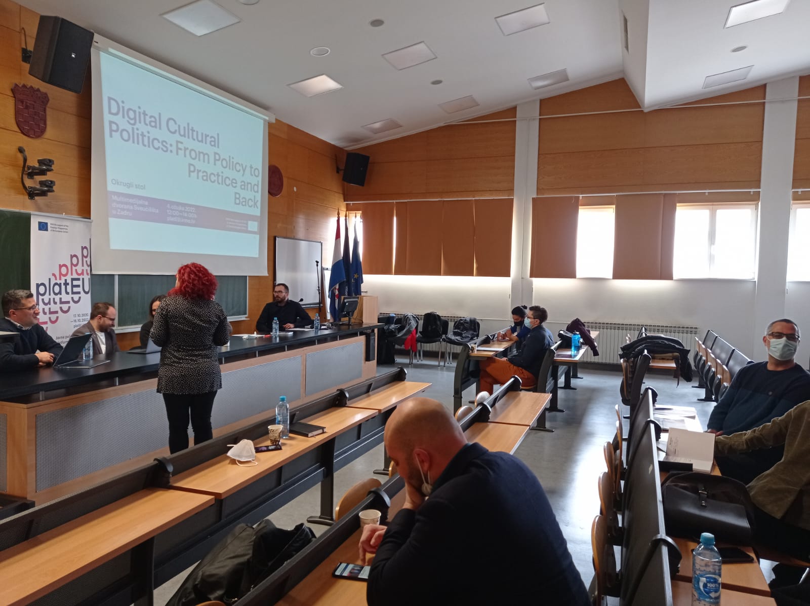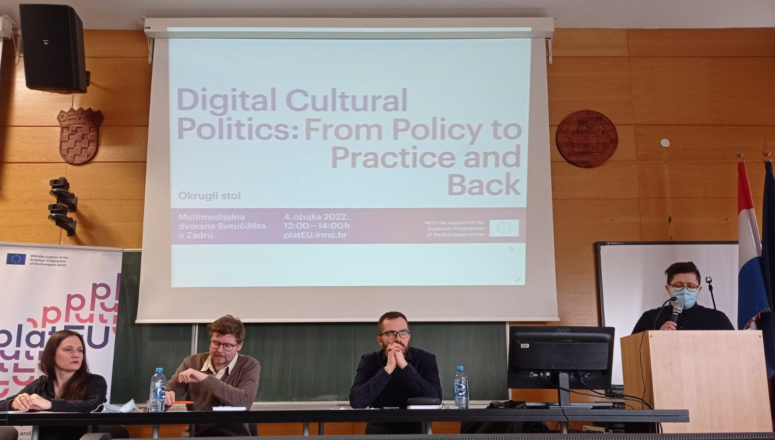Department for Culture and Communication at IRMO organized a round table entitled ‘Digital Cultural Politics: From Policy to Practice and Back’ as a part of the activities of the Erasmus+ Jean Monnet project ‘EU Policies and the Platformisation of the Cultural and Audio-visual Sectors – platEU’. The round table was held on the 4th of March 2022 in the Multimedia Hall of the University of Zadar. Partners in the organisation of the event were the Department of Sociology, University of Zadar and the Zadar Branch of the Croatian Sociological Association (HSD).