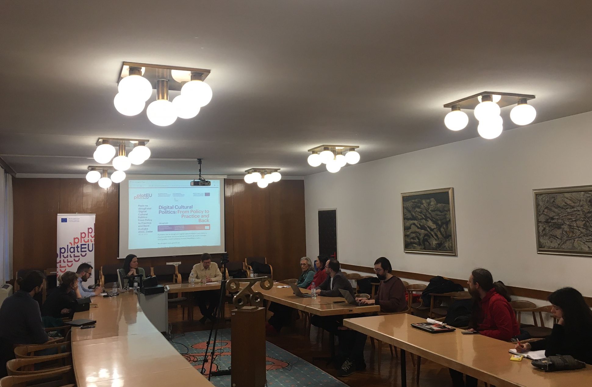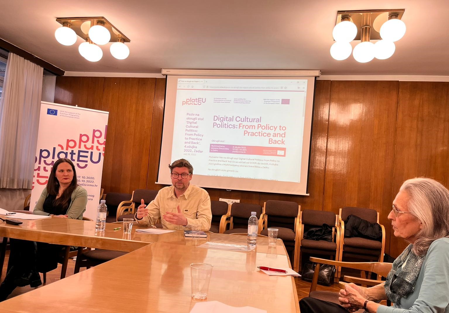 As part of the Erasmus + Jean Monnet project ‘EU Policies and the Platformisation of the Cultural and Audiovisual Sectors – platEU’, Department for Culture and Communication at IRMO organized a round table entitled ‘Towards Critical Digital Cultural Politics? EU, Platforms and Converging Regulation’. The round table was held on the 3rd of March, 2022 in the Council Hall of the Faculty of Humanities and Social Sciences, University of Zagreb. Partners in the organisation of the event were: Department of Sociology, Faculty of Humanities and Social Sciences, University of Zagreb and the Section for Sociology of Media of the Croatian Sociological Association (HSD).